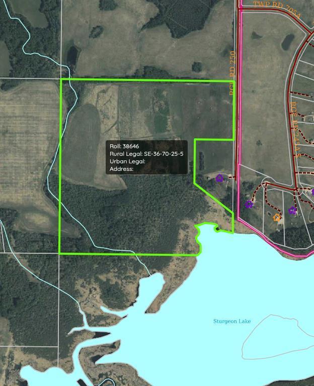 Great 146.27 Acre parcel of land located 45 minutes East of Grande Prairie and bordering the west side of Sturgeon Lake. The land is nicely located on the end of a private dead end road and slopes off to the south west overlooking the lake and the valley. Tons of great building spots or spots to build a cabin back in on the lake. Approx 40 Acres open and the rest is treed . Land has an older fence on 2 sides but would need some work. Lake comes right into property and there is an easement through the MD restricting any construction on the lake shore.